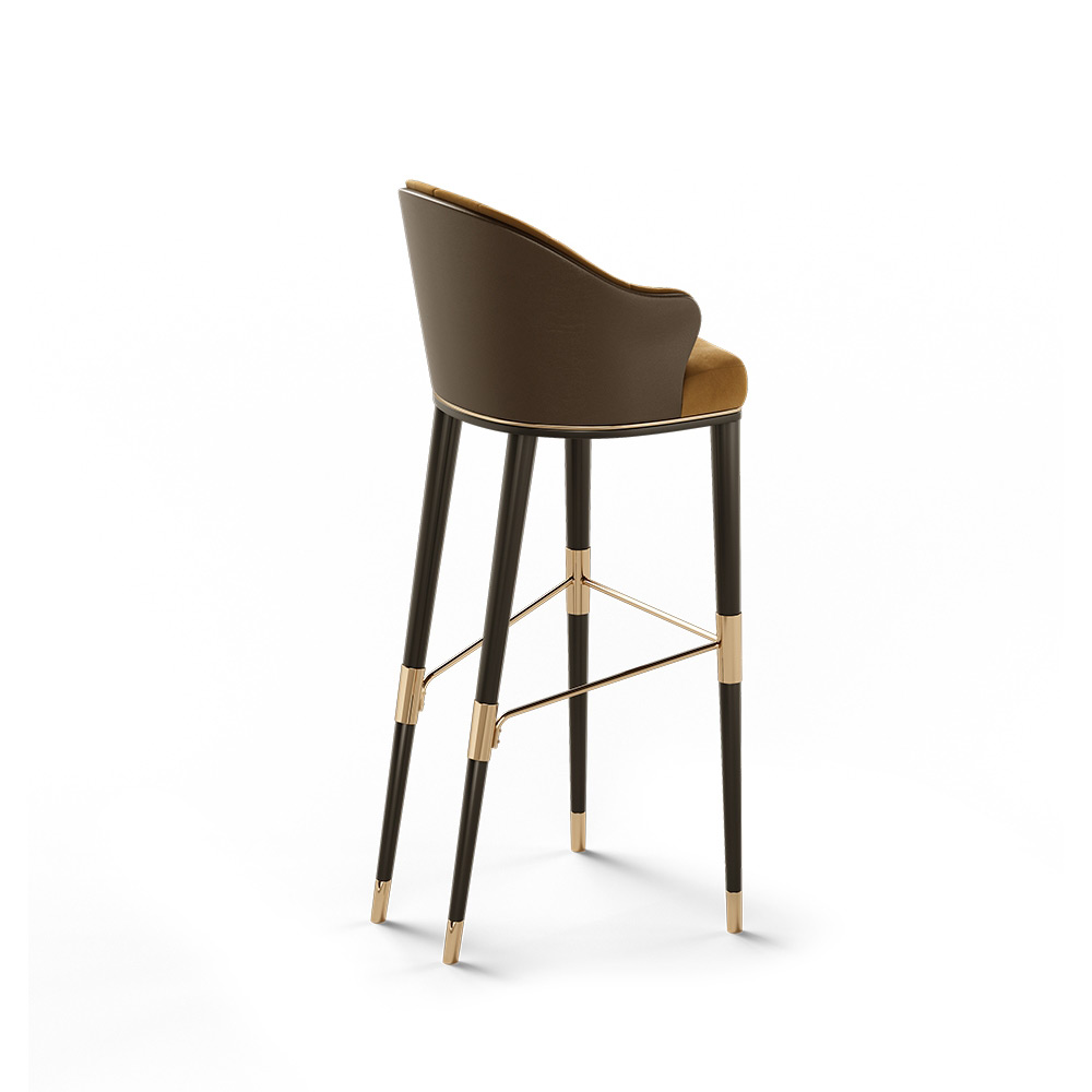 The Ellis bar chair was designed to be the highlight of any bar. This luxury statement piece has a mid-century design with a contemporary twist. Using a rich fabric combination, Ellis features a round shape on the back, exquisitely finished with a footrest framing and black lacquered legs.