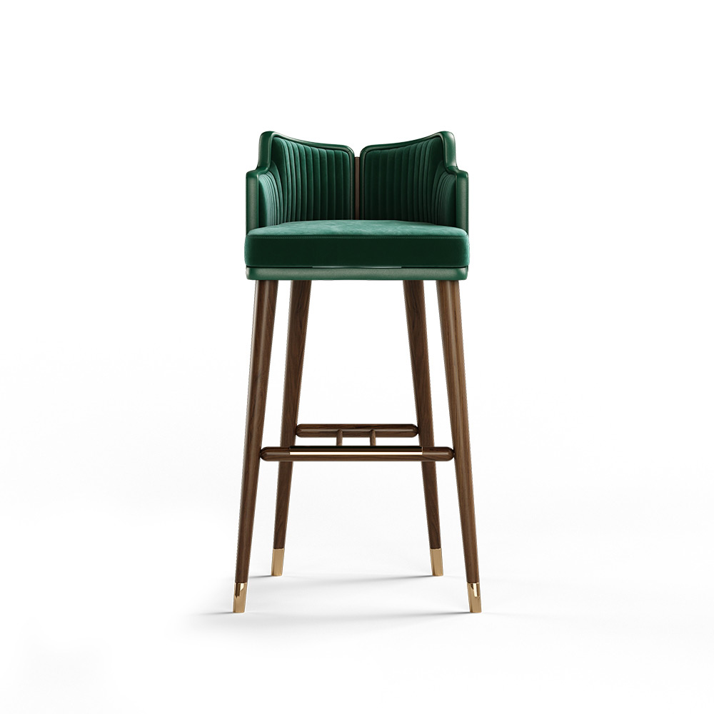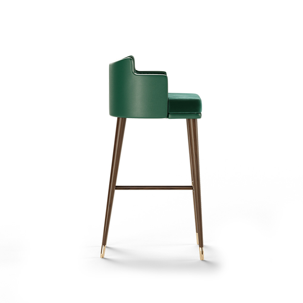 The Ervin bar chair has a deluxe look, perfect to fit in any bar to enjoy a cocktail. It features a round shape on the back upholstered in a soft fabric, combined with lacquered legs and accented by polished brass details as the footrest.