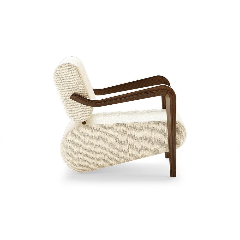 Inspired by the vintage vibe of the ’60s, the Clark armchair brings an edgy presence to any interior. The geometric upholstered sections composing the design are supported by a discreet and elegant brass element, almost invisible, while the armrests in an irregular wood shape add to piece a more attractive look.