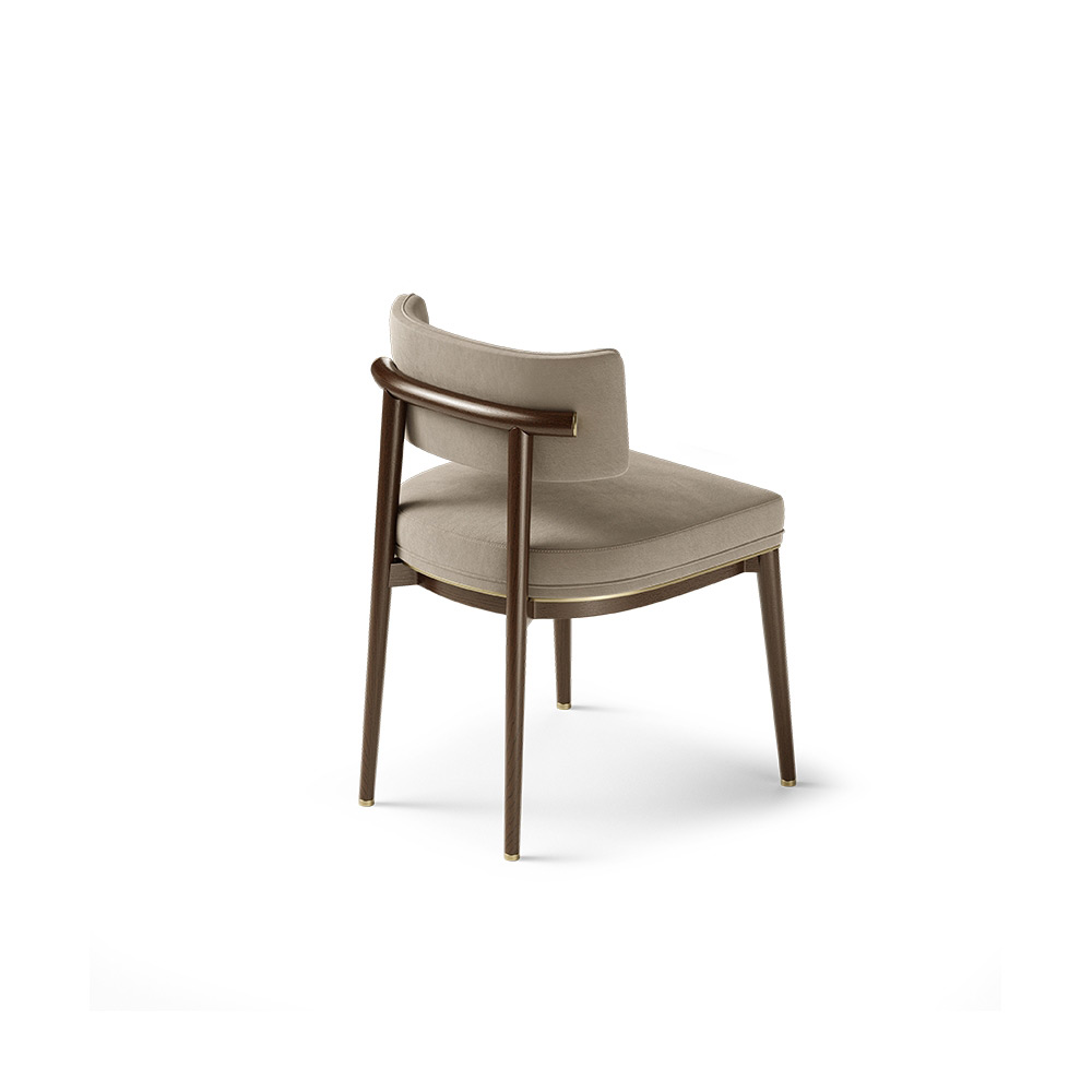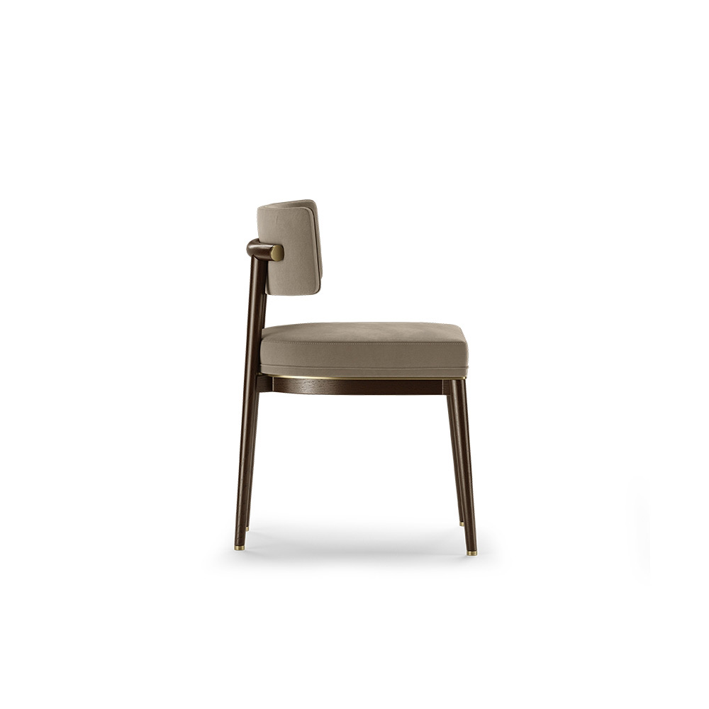 The exposed legs support a deep upholstered seat, which is elegantly embellished with an almost invisible brass feature, while the upper wood body guides the eye through a generous backrest in a rectangular shape. A minimalistic design that ensures the necessary comfort.