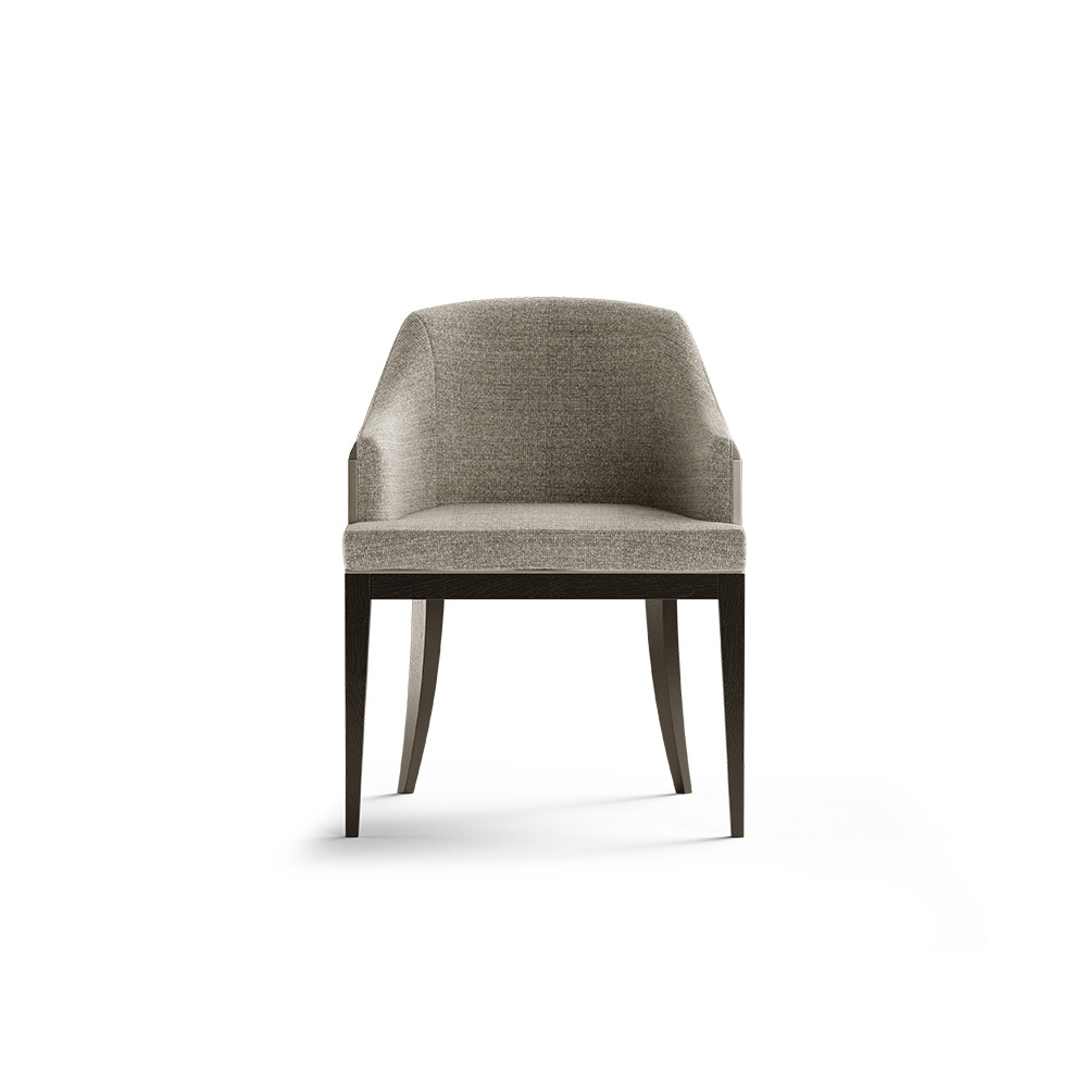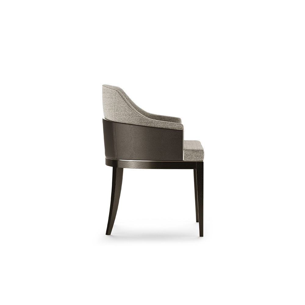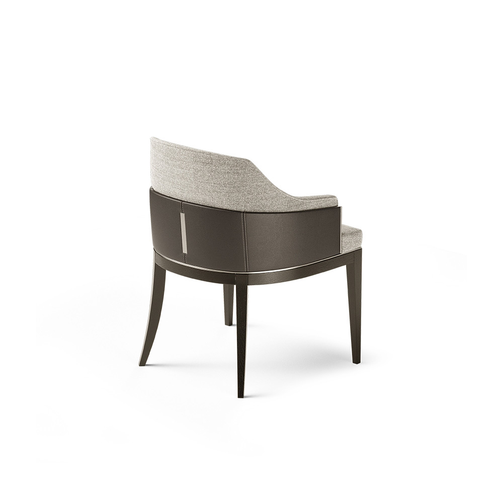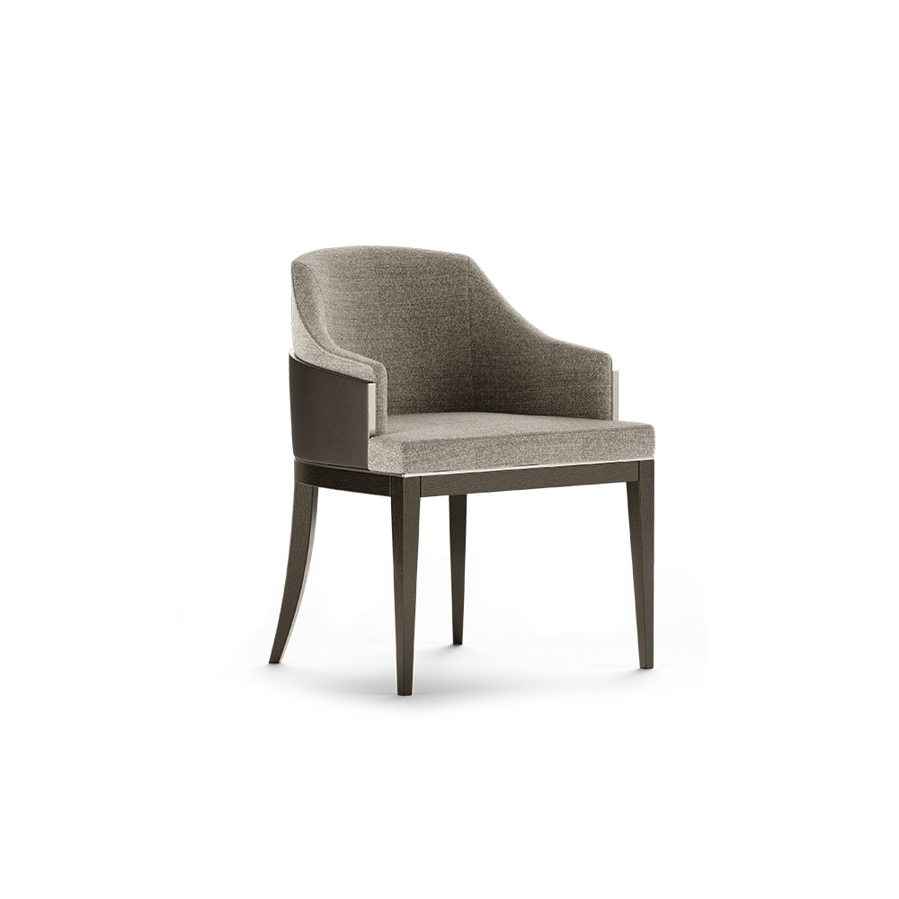 Featuring a large deep seat and an enveloping and cozy curved backrest, the Wolfe dining chair brings a sophisticated appearance to any design. The solid wood structure, which is protecting the upholstered backrest, creates a feeling of strength, while the brass element gives the design a luxury feel.