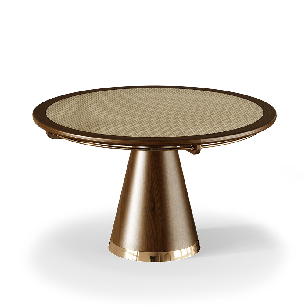 Holiday’s design makes use of the current trend in the interiors – rattan – to create the main feature of the dining table. The natural fiber positioned in the center of the piece, which is protected by a robust circular glass, contrasting with noble materials, creates an elegant and sophisticated design providing a warm feel.