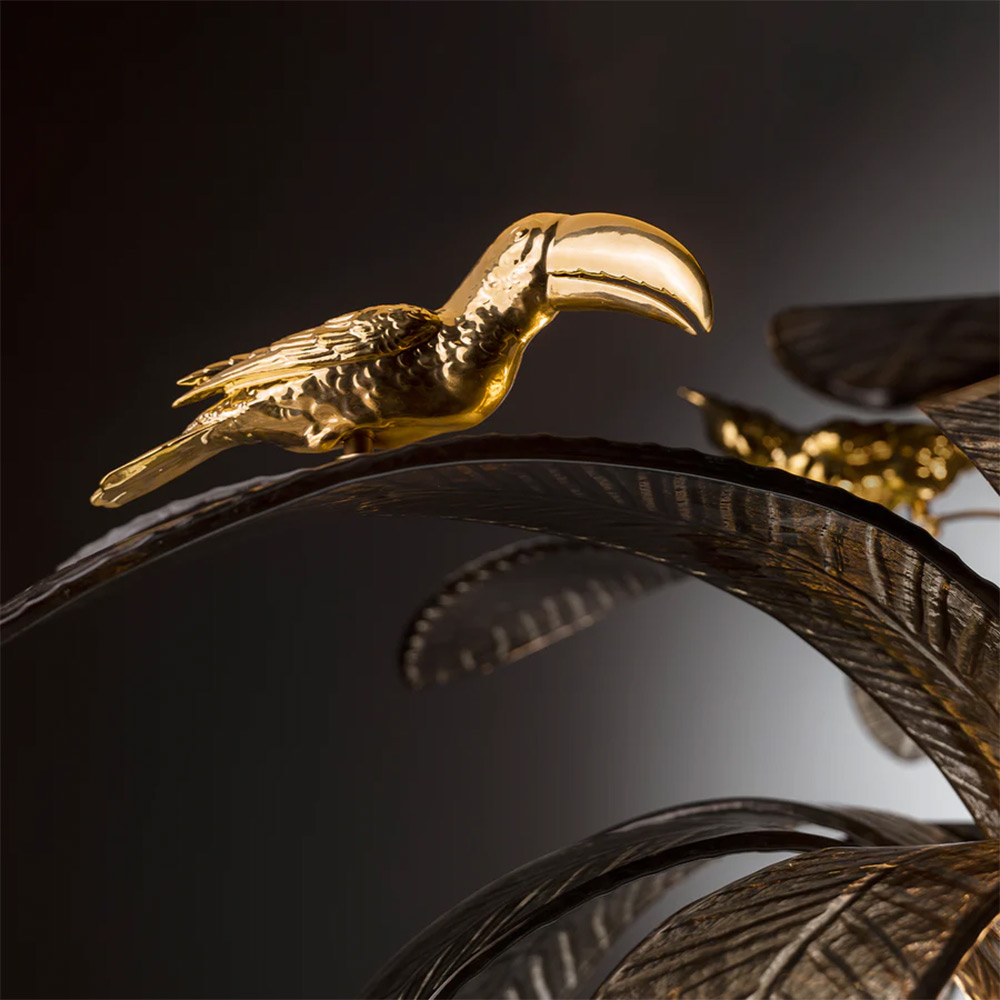 Like an unfolding flower, the chandelier is composed of petals with a naturalistic texture on which tropical birds rest. Parrots and toucans in 24 ct gold-painted porcelain stand out on this superb chandelier that exudes sophistication and exotic charm.