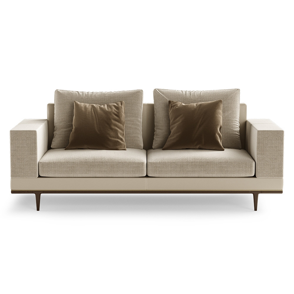 The Gibbings sofa has the false appearance of a simple design due to its straight lines. When looking closer at it, the exquisite seam details stand out, balancing elegantly with brass elements adorning them.